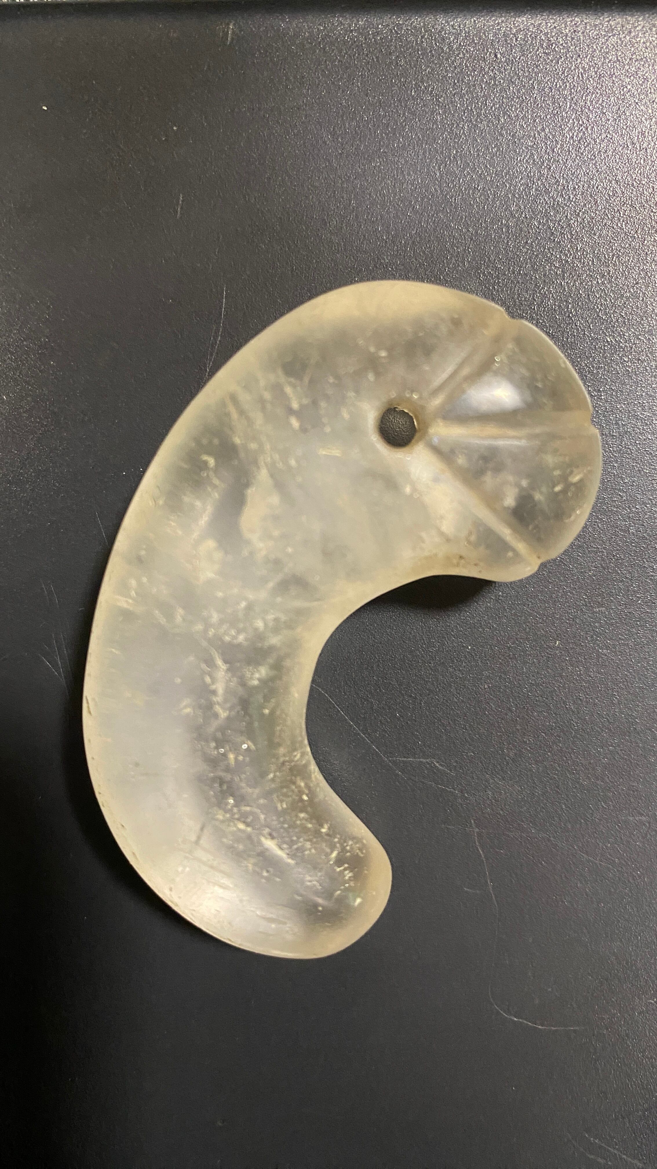 美しい虹彩と、透き通る質感をたたえた上質な水晶製の丁字彫り勾玉。古墳期の護符・祭祀具とされる造形で、長さ約5.5cm・厚さ約1.8cmの堂々たる存在感を誇ります。
