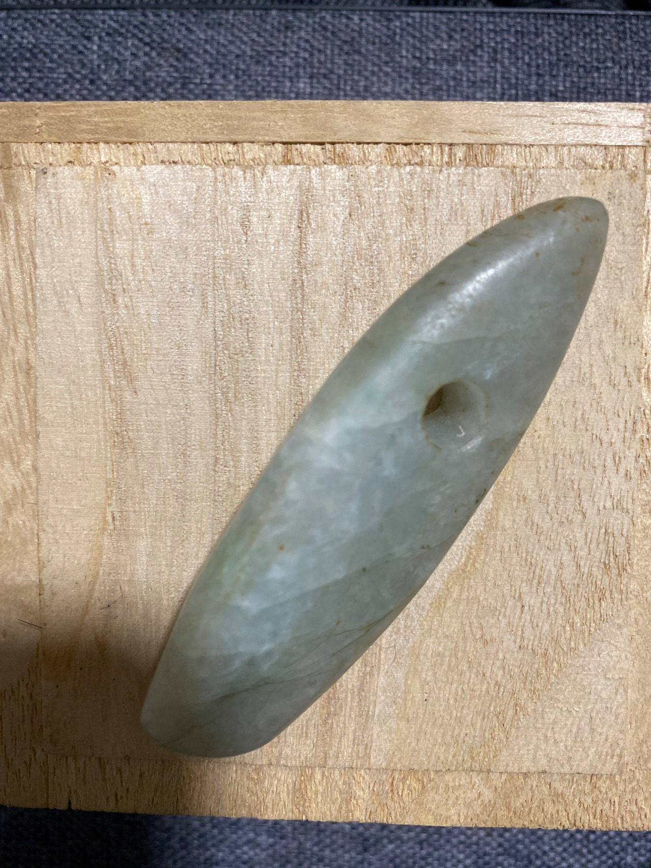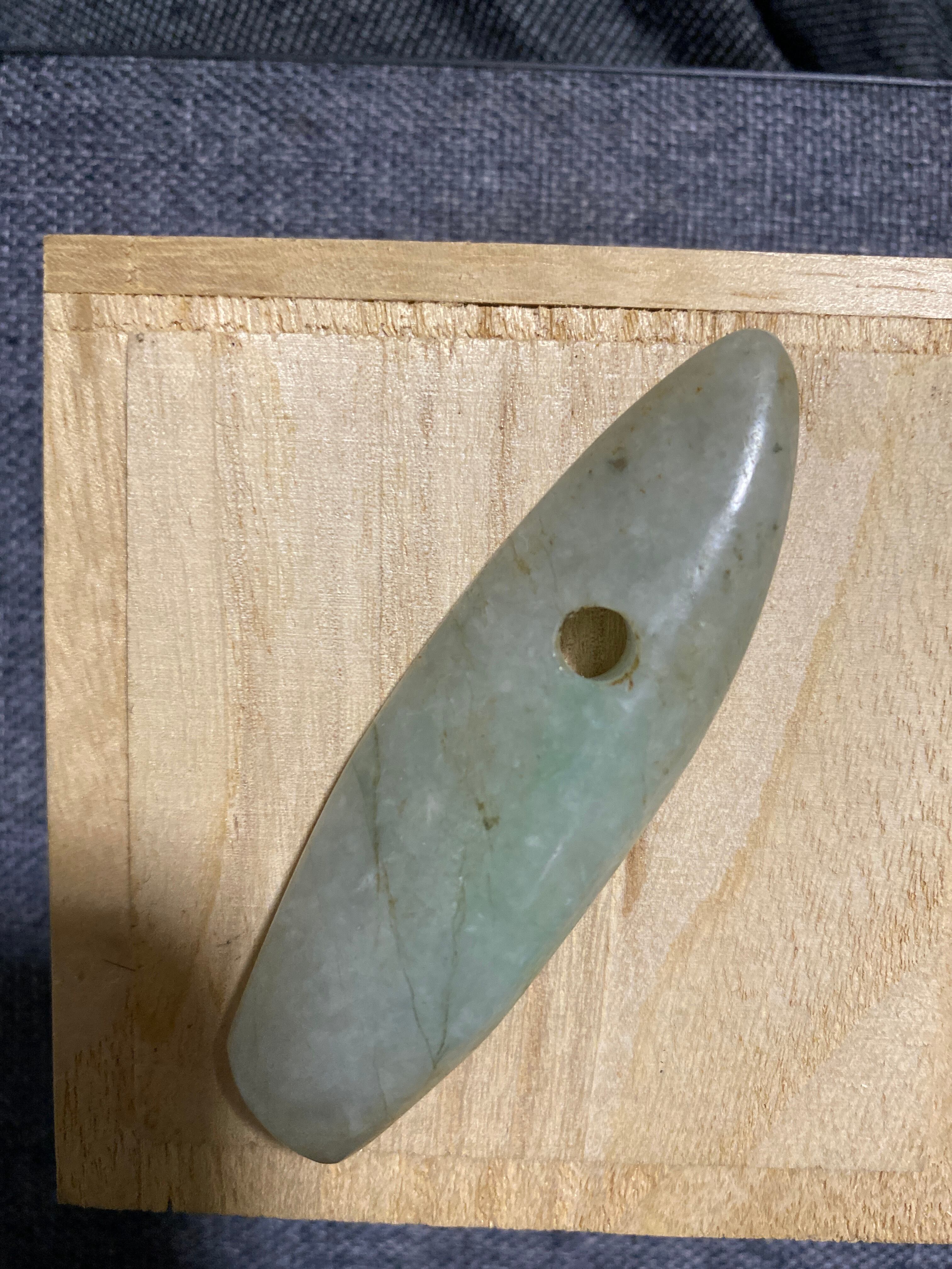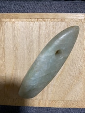 細長く洗練されたシルエットに、一点のみ穿孔された姿。まるで古代の人々が祈りと共に磨き上げた護符のような佇まいを感じます。